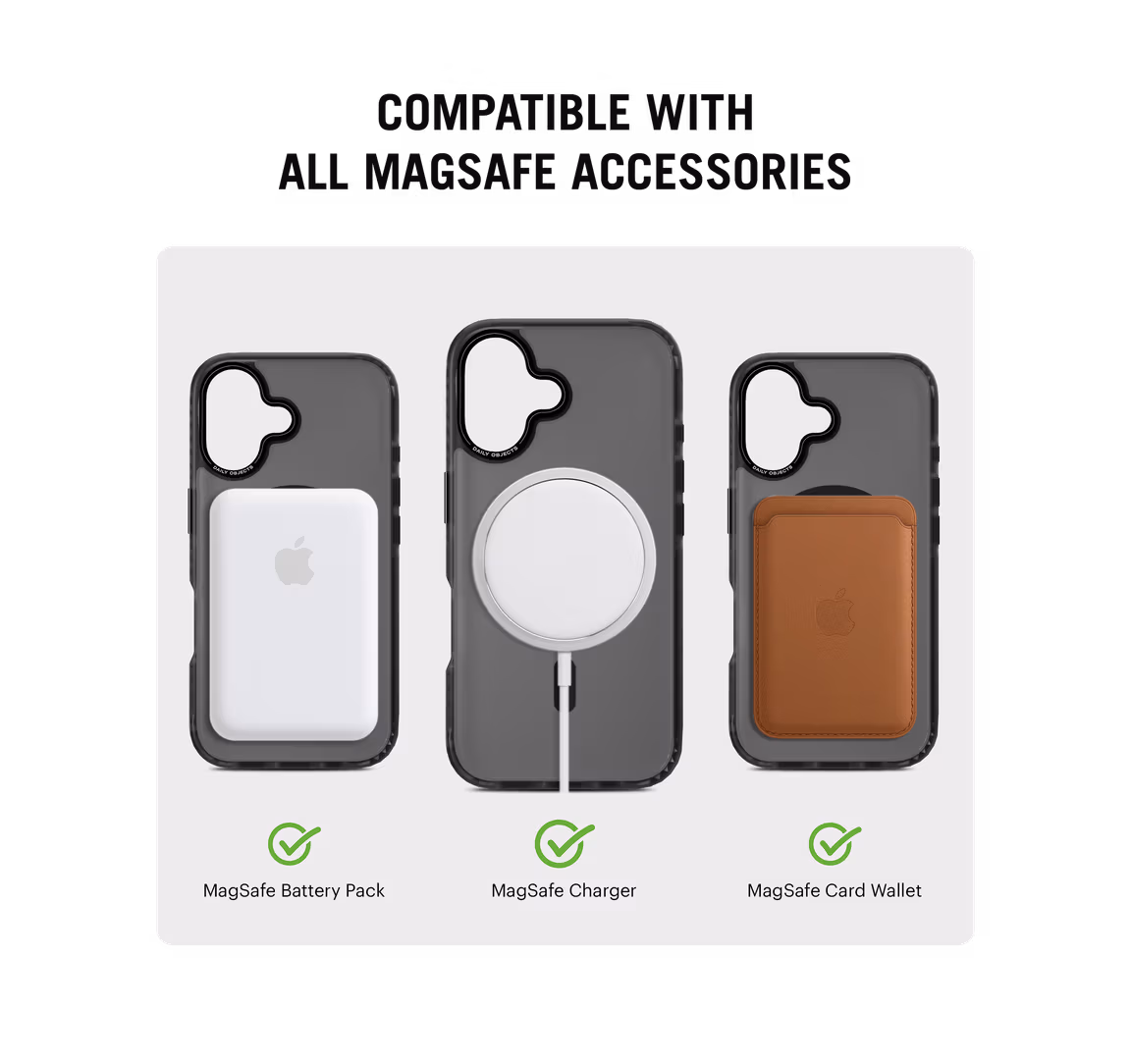 Equipped with MagSafe technology, Nimbus MagSafe Phone Case is compatible with all Qi-Certified wireless chargers and other MagSafe attachments.