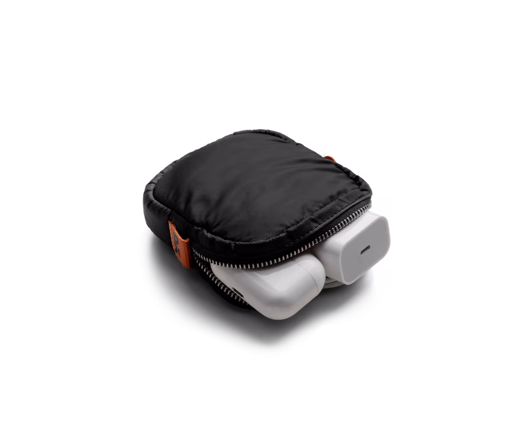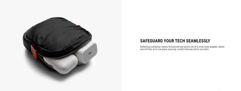 Reflecting a utilitarian nature, this pocket-size pouch can fit a small sized adapter, cables and AirPods, all in one place, assuring scratch-free security to your tech.
