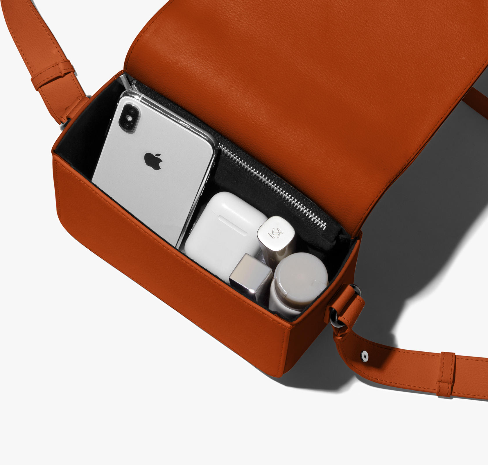 - The main zippered compartment with polyfill cushioning assures scratch-free security to your requisites like wallet, AirPods, makeup, keys and more.