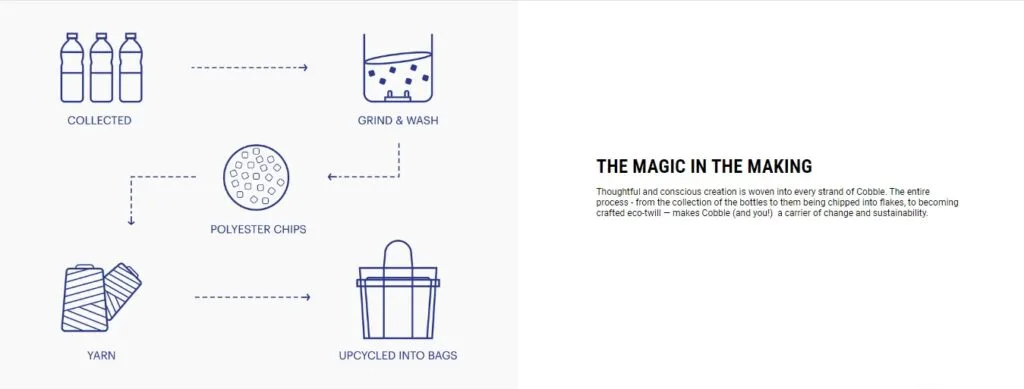 Thoughtful and conscious creation is woven into every strand of Cobble. The entire process – from the collection of the bottles to them being chipped into flakes, to becoming crafted eco-twill — makes Cobble (and you!) a carrier of change and sustainability.
