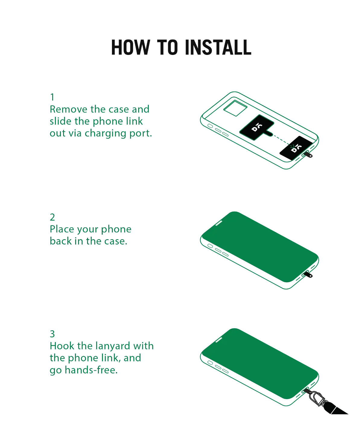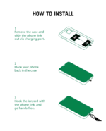 - For easy installation, remove the phone case, slide the phone link out through the charging port and put the case back on. Now hook the lanyard and go hands free.