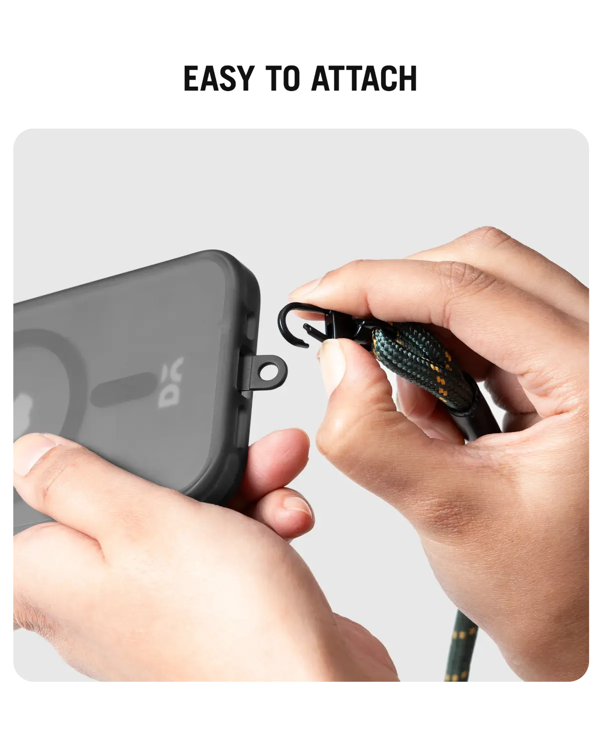 - For easy installation, remove the phone case and slide the phone link out through the charging port. Now, put the case back on and hook the lanyard with the phone.