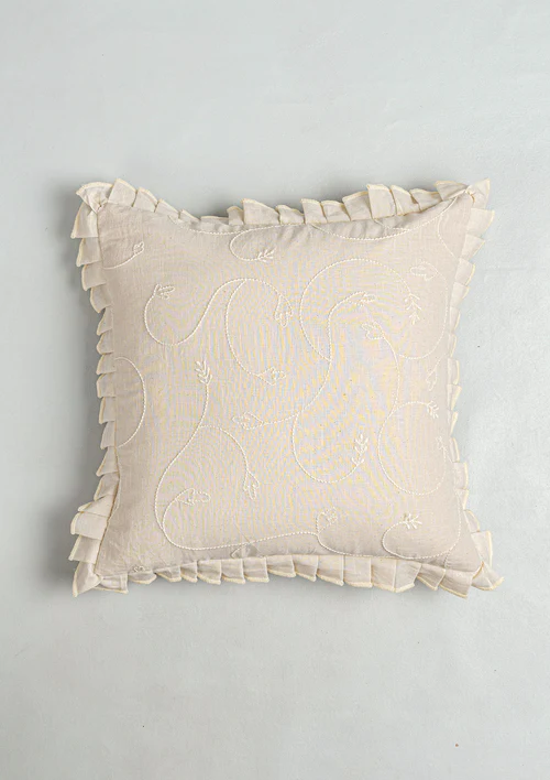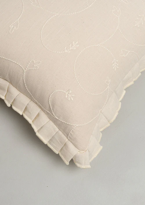 Bring home a whisper of elegance with this dainty embroidered cushion cover, featuring cream-on-cream embroidery that’s subtle and refined. Finished with a delicate frill edge, this decorative cushion cover for sofa is a soft, rich accent perfect for serene, timeless spaces. Pair this cotton cushion cover up with our Loom, stella or stamps cushion cover to create a complementing set.